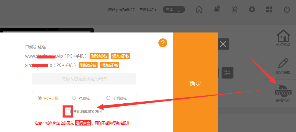 绑定类型详解A 绑定PC+手机,访问时做到自动识别,即:手机访问就是手机网站,PC访问就是PC版网站 B 绑定PC,通过PC或手机访问时均看到PC版网站 C 绑定手机,通过PC或手机访问时均看到手机版建站 注意绑定域名 时填写您带 www前缀的域名即可 如www.您的域名.com 注意:一般绑定域名需要绑定 www前缀的域名
